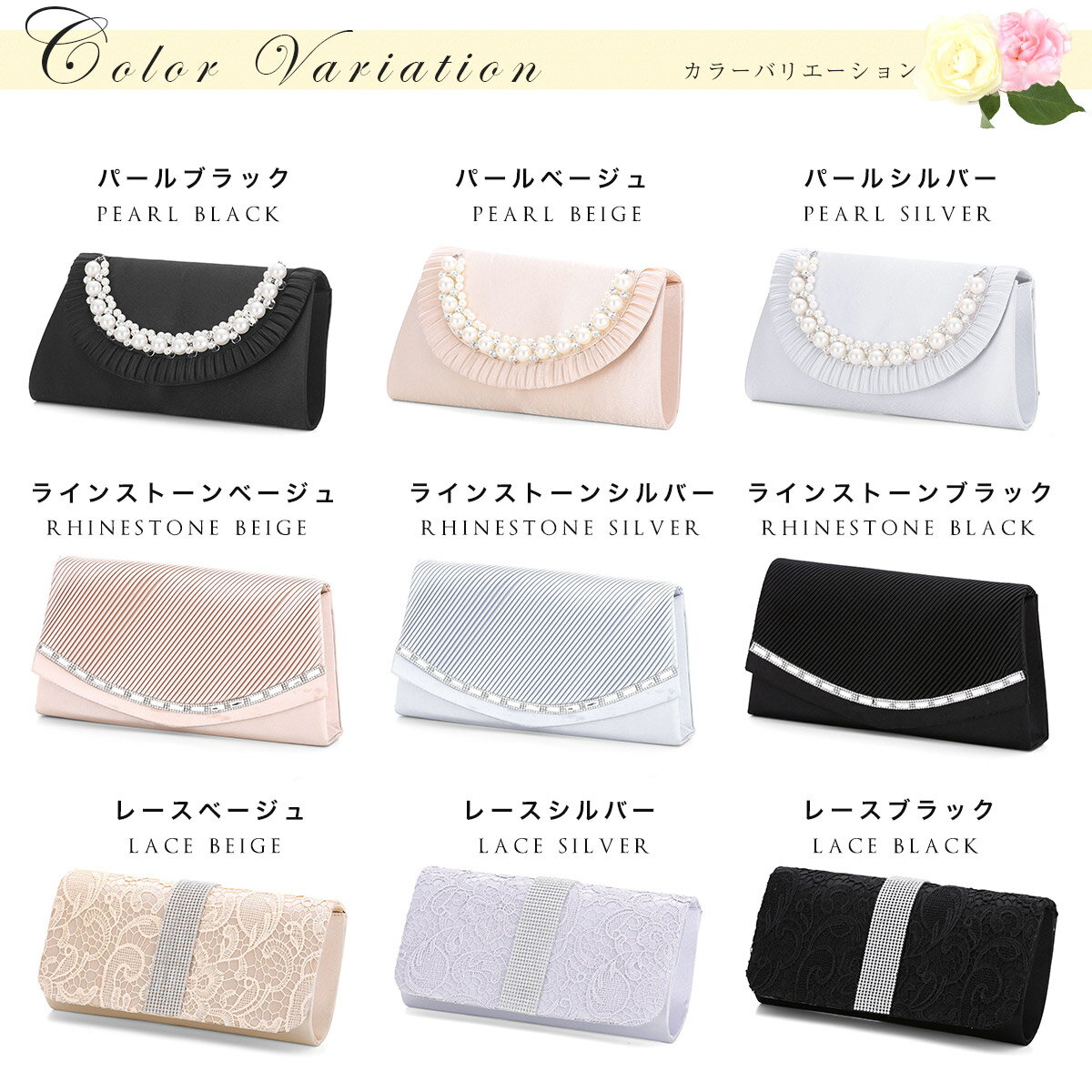 【カラー】 パールブラック / パールベージュ / パールシルバー ラインストーンベージュ / ラインストーンブラックシルバー / ラインストーンブラック レースベージュ / レースシルバー / レースブラック 【サイズ】 【ラインストーンタイプ】 高さ:14.5cm 横幅:30cm マチ:4cm 重さ:約320g 【ラインストーンタイプ】 高さ:15cm 横幅:30cm マチ:5cm 重さ:約300g 【レースタイプ】 高さ:14.5cm 横幅:30cm マチ:5cm 重さ:約310g 【備考】 マグネットボタン開閉 メインスペース内:オープンポケット×1 チェーン長さ: 約120cm チェーン取外し可能 【素材】サテン 【生産国】中国 ※こちらの商品はご注文日によって発送の納期が異なります。